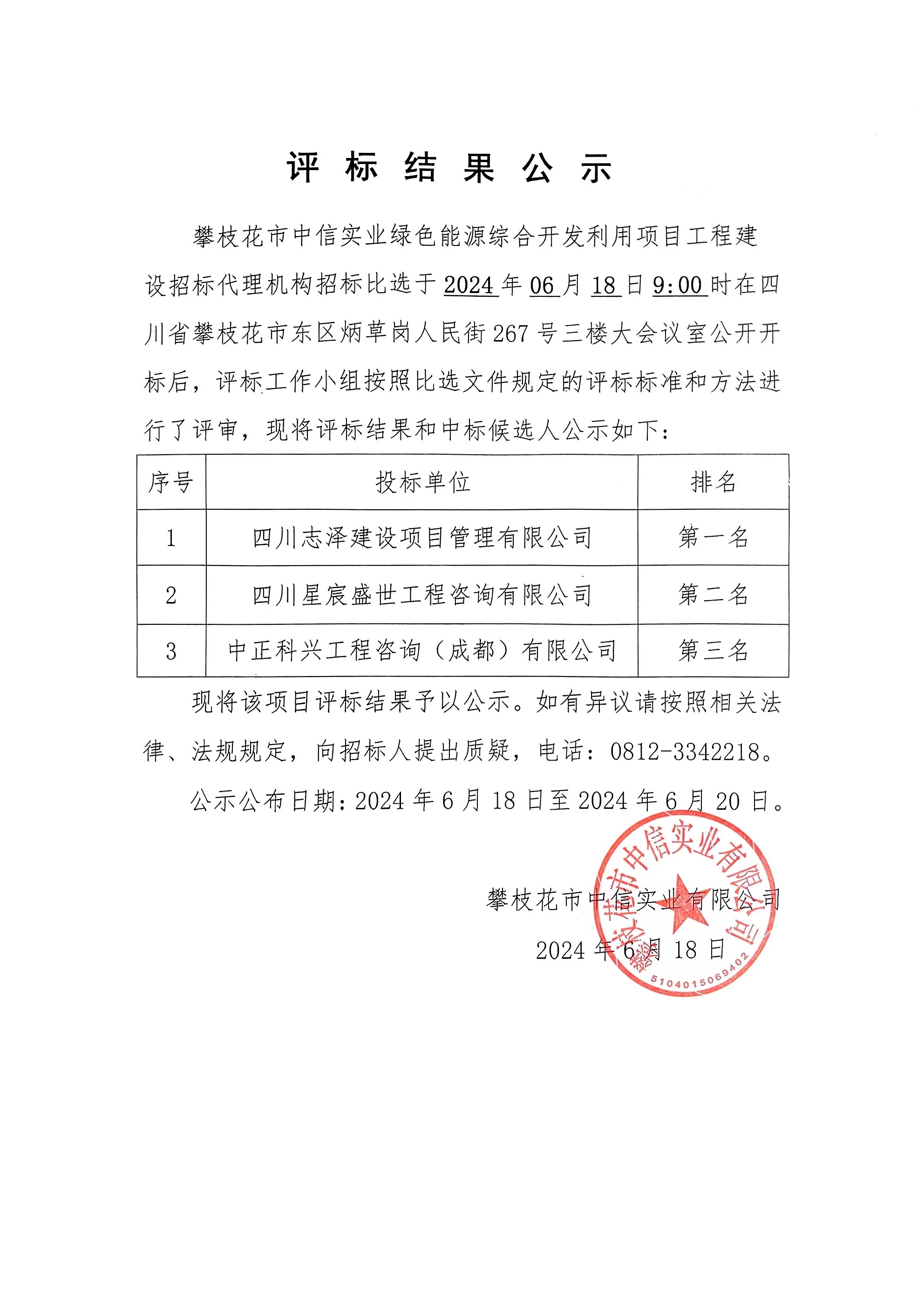 攀枝花市中信實業(yè)有限公司綠色能源綜合開發(fā)利用項目工程建設(shè)招標代理機構(gòu)招標比選評標結(jié)果公示